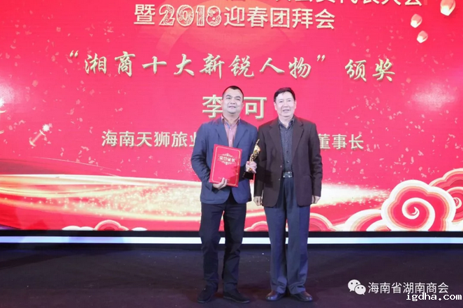 【海南省委原常委/海南省军区原政委贺贤书为副会长,海南天狮旅业投资有限公司董事长李可,颁发中国湘商风云榜“全球湘商十大新锐人物”奖杯和证书(此奖项由中国商业联合会、中国商报社等单位联合评选)】