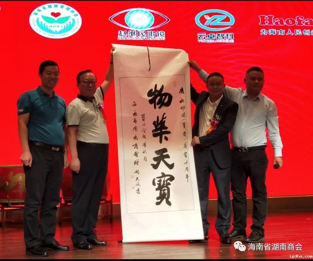 1020日下午,我会秘书长陈克新、副会长王星、副秘书长周建成等受邀参加海口市邵阳(宝庆)商会第三届第三次会员大会暨建会十周年庆典。陈克新秘书长在致辞中,代表曹会长、李会长及全体商会会员向邵阳商会表示祝贺,并希望以后两会之间多加强合作,密切联系;克新秘书长还列举了邵商在世界范围内经商的一些数据,表示邵商的开拓精神值得我们大家学习。陈克新秘书长代表商会向邵阳商会赠送字画《物华天宝》(我会专业顾问胡天波老师作品)。