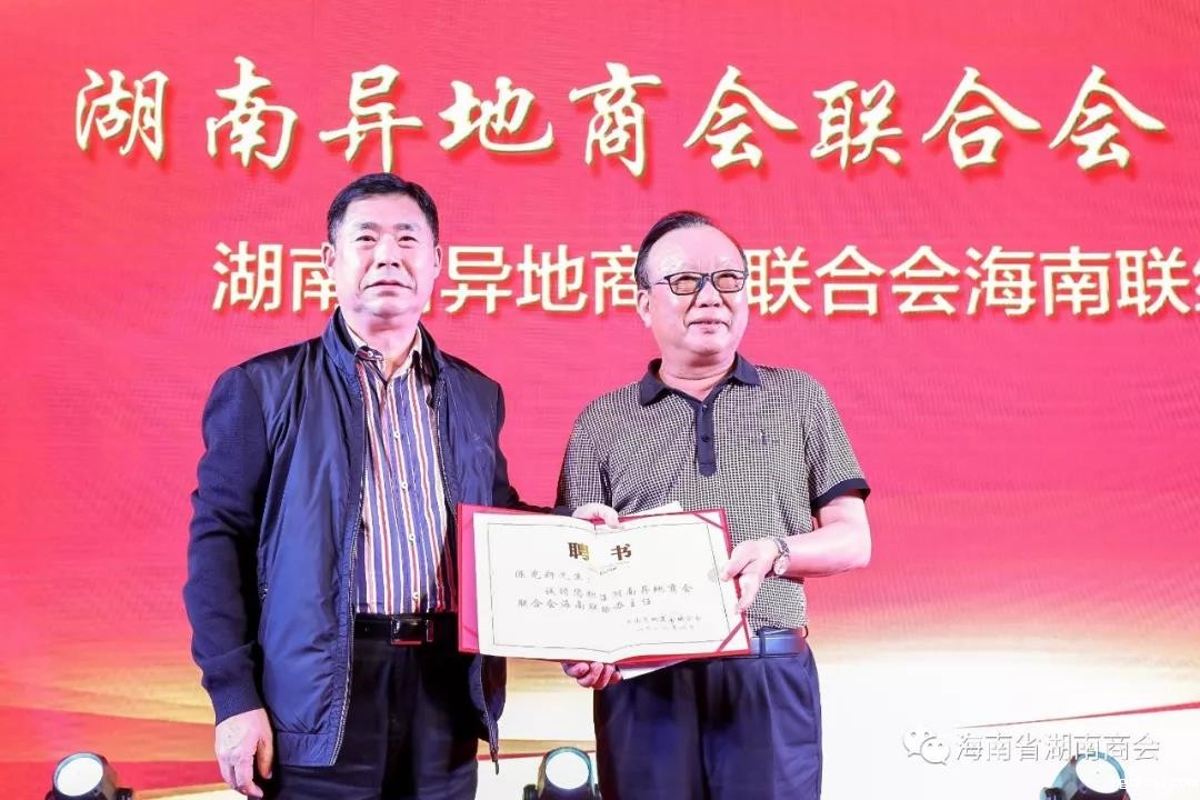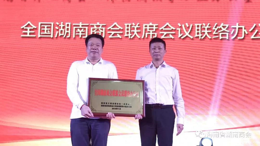【海南省委统战部非公经济处处长、海南省工商联党组成员王益富为商会授湖南省工商联合会“全国湖南商会联席会议联络办公室”匾牌、余光泉常务副会长代表商会上台接受牌匾】