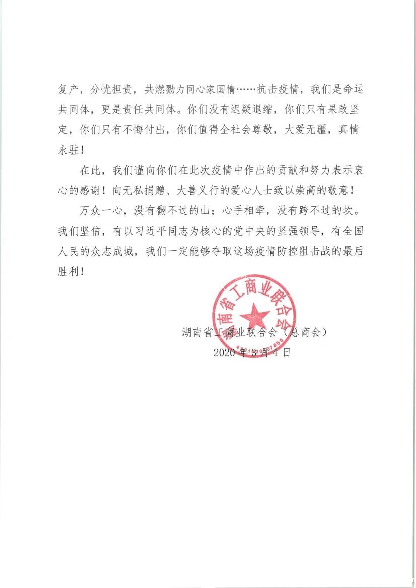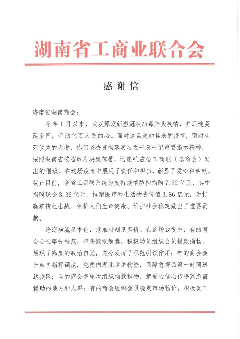 【感谢信】湖南省工商联致信感谢我会在抗击疫情中所做的突出贡献